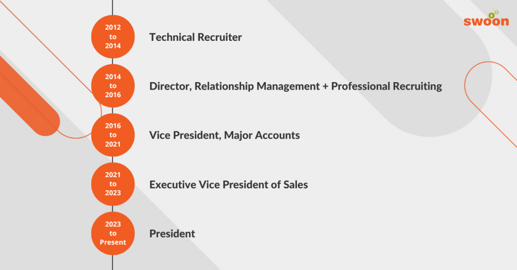 Lori’s journey within Swoon has been nothing short of amazing. She began as a Technical Recruiter in Swoon’s sister company at the time, NextGen Global Resources. Then, she transitioned to Swoon and quickly rose through the ranks as the Director of Relationship Management and Professional Recruiting, Vice President of Major Accounts and then the Executive Vice President of Sales.