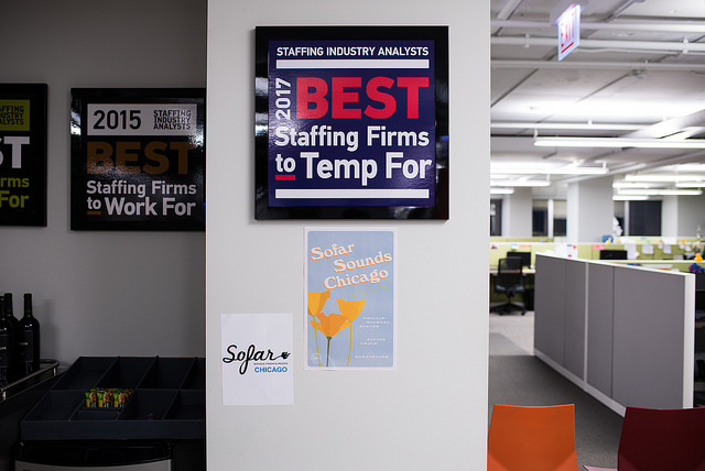 Antoine Smith, a recruiter in our Chicago office, nominated us to host a Sofar show after speaking with Michelle Baker, our CEO who is passionate about music. Swoon is a very musically-cultured environment, and we felt our space would be a great fit for a show. We host Record Club every Friday during lunch where employees bring in their favorite records to play on the office record player. We share weekly blog posts about music called “Swoon Tunes” and we named all our conference rooms after music venues throughout Chicago such as “Schubas,” “The Empty Bottle” and “Lincoln Hall.”
