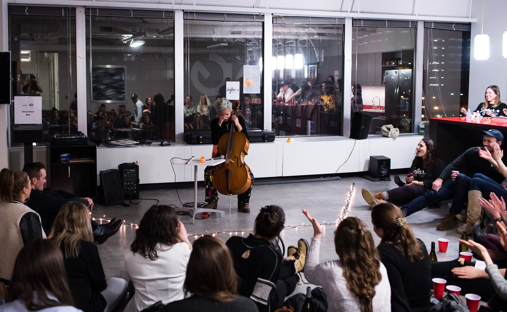 The evening began with an intro from Sofar and Antoine about the night and our space. Everyone was seated around the “stage” and ready for a great acoustic set. Sylvie Grace started the evening with an intimate set played on her cello.